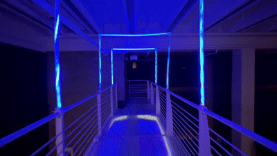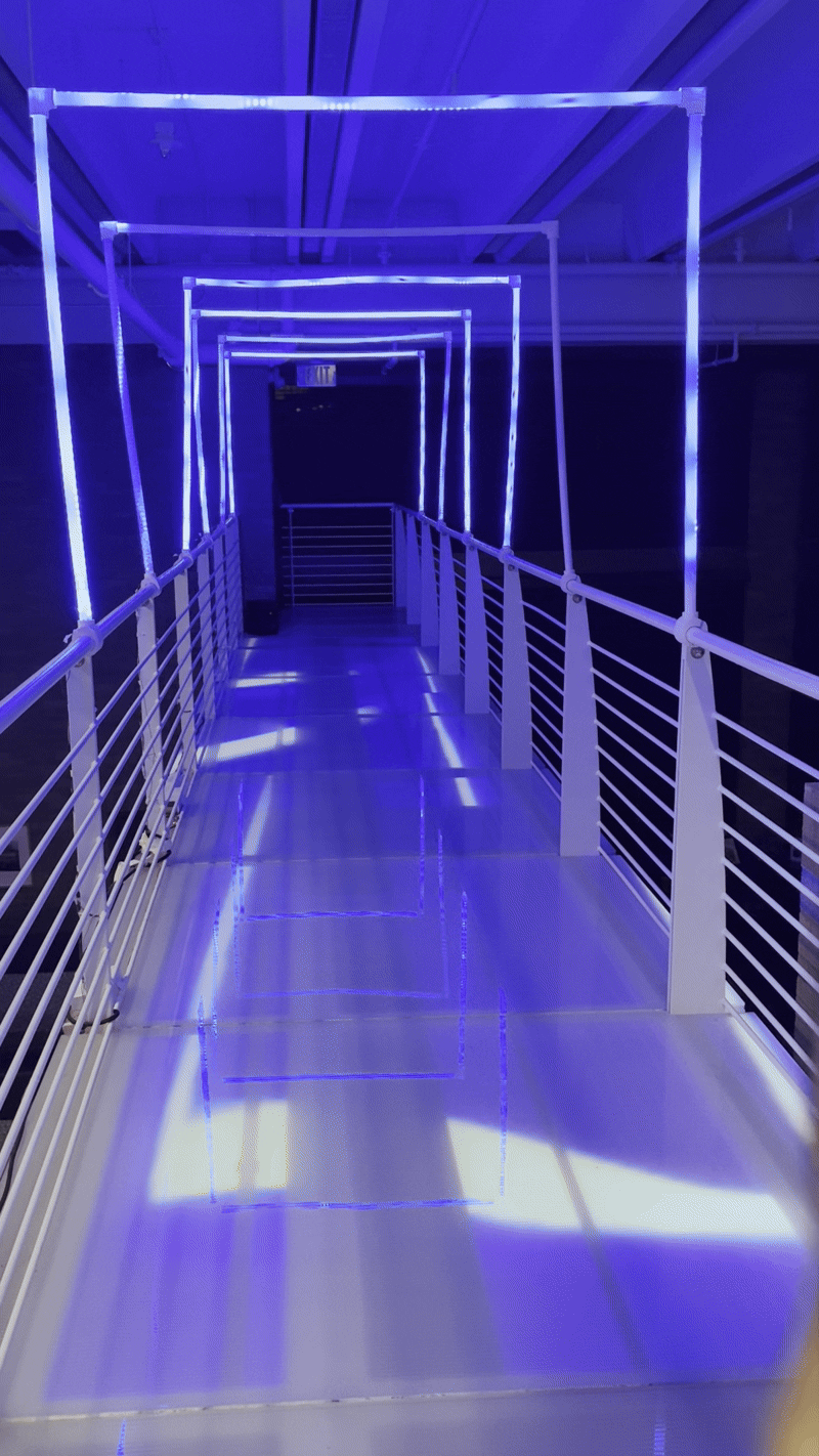 An interactive light and sound installation on the 4th floor exit bridge of the Doty Fine Arts Building. PIR sensors detect movement across seven PEX arches, triggering reactive LED lighting, sound, and projection, transforming a forgotten passageway into an immersive experience themed around water and movement.